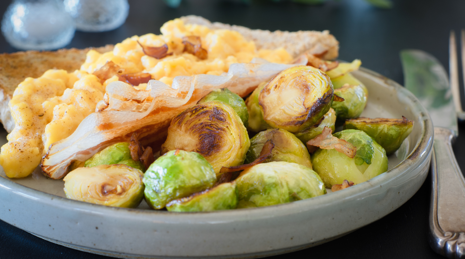 Use a spoon or scoop to make 4 wells or cups in the Brussels sprouts mixture. Crack an egg into each depression and season with pepper, salt and red pepper flakes.